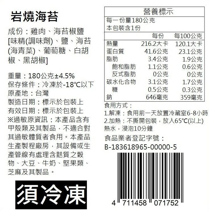 ※過敏原資訊:本產品生產製程廠房,其設備或生產管線有處理含麩質之穀物、甲殼類、大豆、牛奶、堅果類、芝麻及其製品