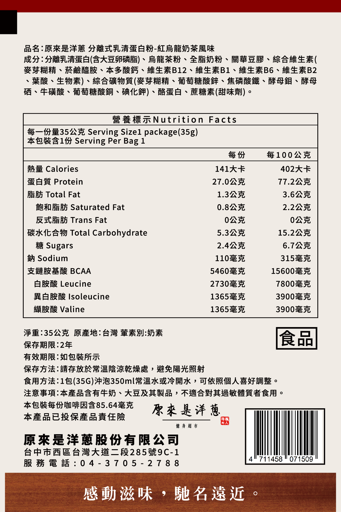 成分:分離乳清蛋白(分離乳清蛋白、大豆卵磷脂)、烏龍茶粉、全脂奶粉、關華豆膠、綜合維生素(麥芽糊精、菸鹼醯胺、本多酸鈣、維生素B12、維生素B1、維生素B6、維生素B2、葉酸、生物素)、綜合礦物質(麥芽糊精、葡萄糖酸鋅、焦磷酸鐵、酵母鉬、酵母硒、牛磺酸、葡萄糖酸銅、碘化鉀)、酪蛋白、蔗糖素(甜味劑)。