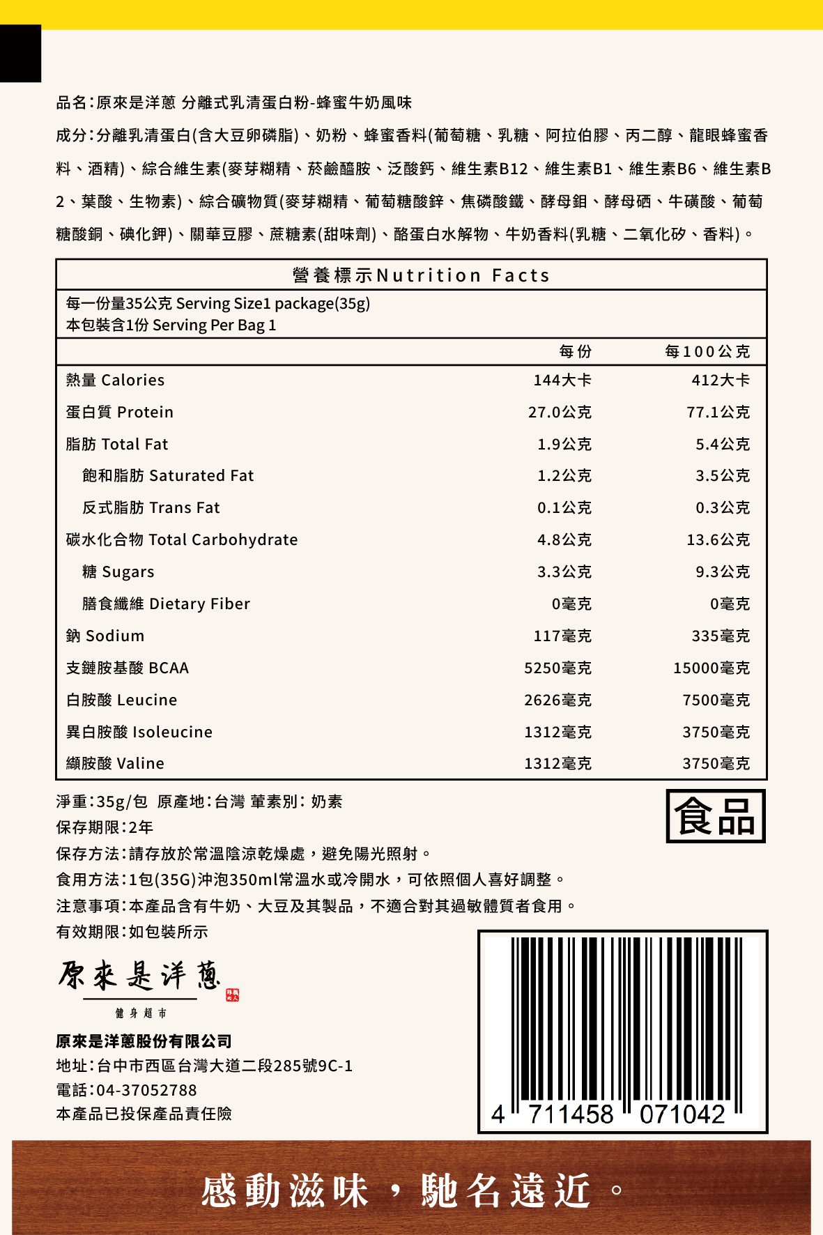 成分:分離乳清蛋白(含大豆卵磷脂)、奶粉、蜂蜜香料(葡萄糖、乳糖、阿拉伯膠、丙二醇、龍眼蜂蜜香料、酒精)、綜合維生素(麥芽糊精、菸鹼醯胺、泛酸鈣、維生素B12、維生素B1、維生素B6、維生素B2、葉酸、生物素)、綜合礦物質(麥芽糊精、葡萄糖酸鋅、焦磷酸鐵、酵母鉬、酵母硒、牛磺酸、葡萄糖酸銅、碘化鉀)、關華豆膠、蔗糖素(甜味劑)、酪蛋白水解物、牛奶香料(乳糖、二氧化矽、香料)。