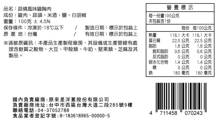 ※過敏原資訊:本產品生產製程廠房,其設備或生產管線有處理含麩質之穀物、甲殼類、大豆、牛奶、堅果類、芝麻及其製品