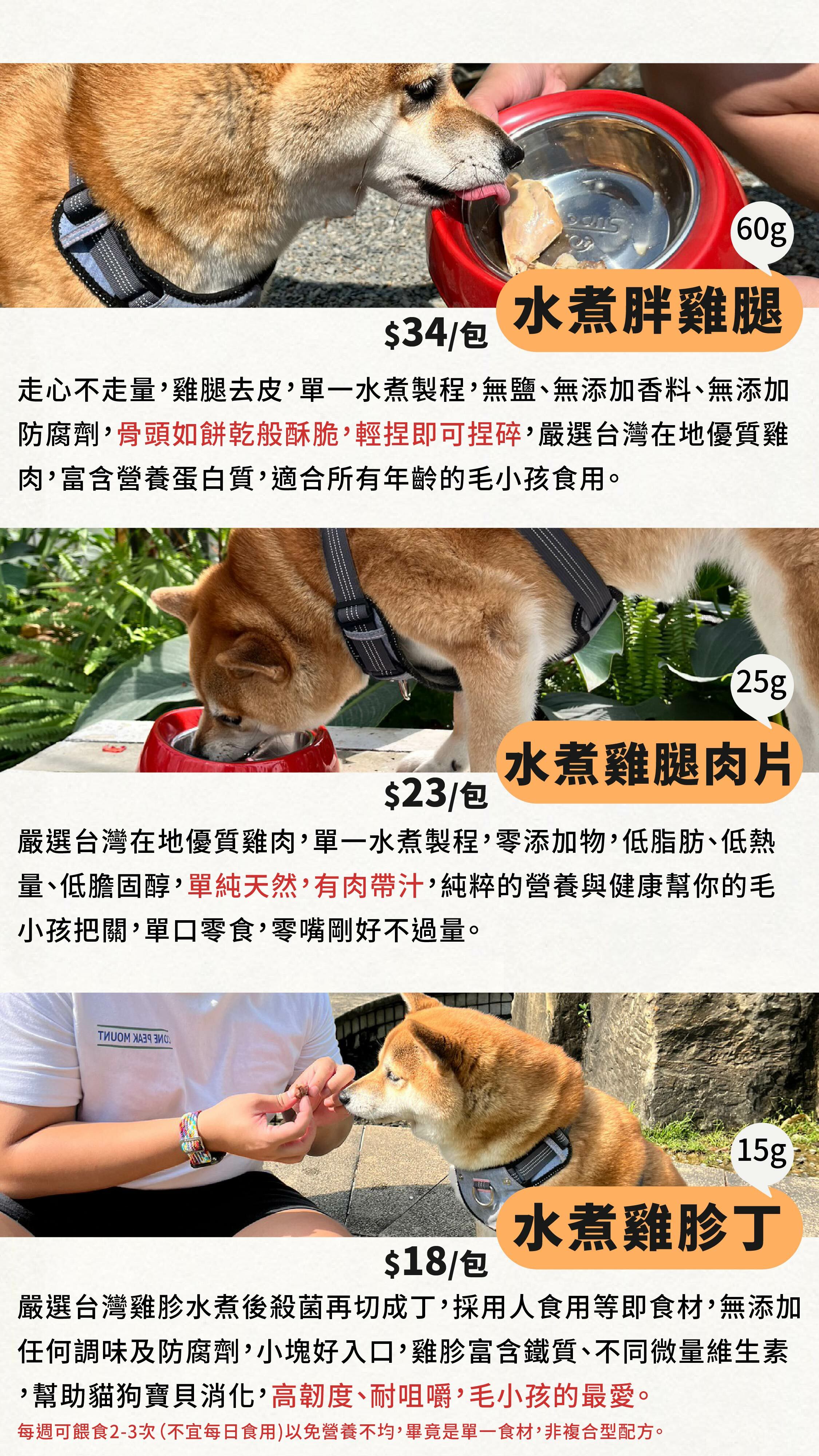 餵食指引:主人可協助剝剪至適當大小,胖雞腿骨頭已熬製成酥脆軟